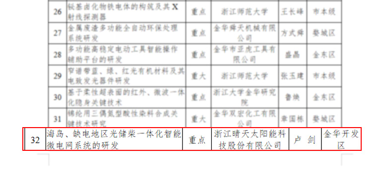 近日,金华市科学技术局公布了2026年度金华市区重大重点科技项目清单,浙江晴天太阳能科技股份有限公司申报的“光储柴一体化智能微电网系统”项目成功入选,标志着晴天科技在面向海外弱电网地区的新能源应用领域取得重要突破。